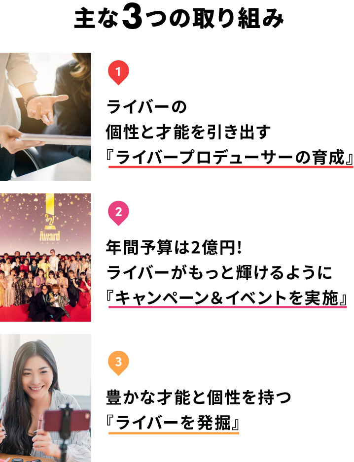 『ライバーという職業の地位を確立し、誰もが個性と才能を発信していける社会の実現』をビジョンに掲げ、公式アンバサダーとともに、さまざまな⽀援を行います。