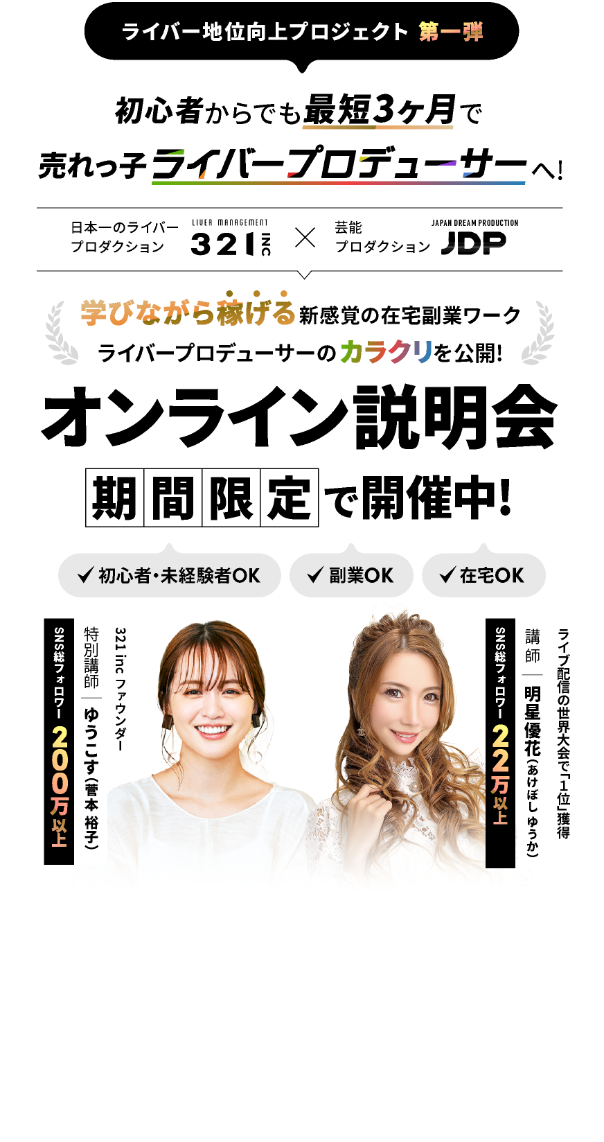 はい、大丈夫です。いま現役で活躍しているライバープロデューサーの中にも、もともとライブ配信に全く興味がなかったという人もたくさんいるのでご安心ください。